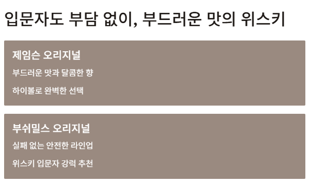 | 첫 위스키 도전 | 제임슨, 부쉬밀스 | 부드럽고 마시기 쉬운 맛 |