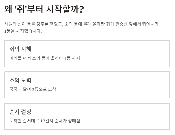 하늘의 신이 동물들을 불러 "1년을 상징할 동물을 정하겠다"고 하자,