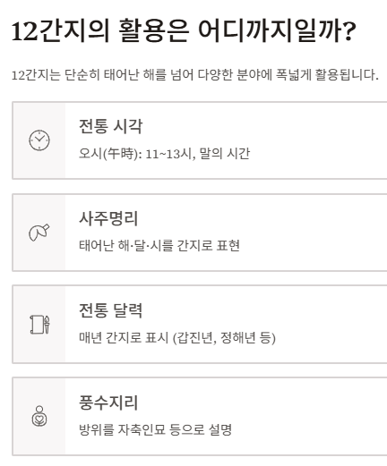 이처럼 12간지는 시간(시), 방향(방위), 순환 구조까지 포괄한 전통문화의 핵심 단위입니다.