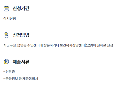 - 보건복지상담센터(129)로 전화하여 신청하여야합니다.