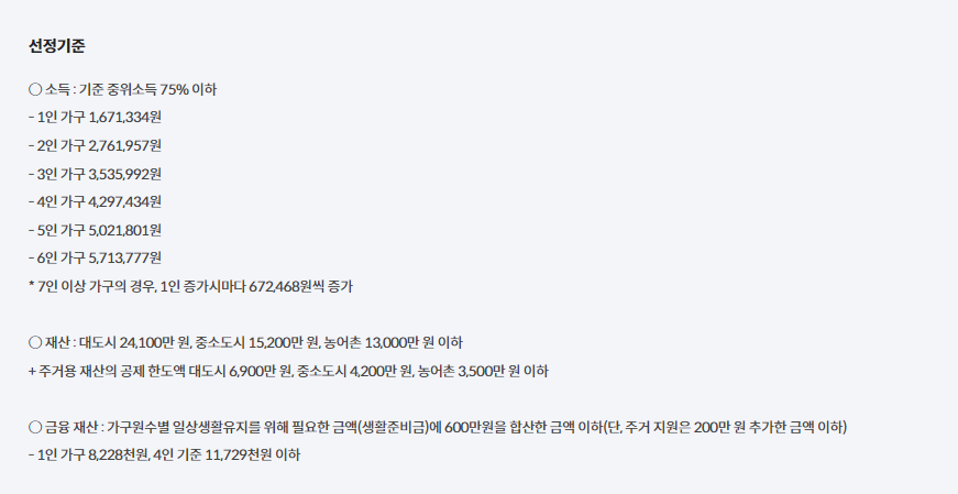 - 가구 소득이 중위소득의 75% 이하인 경우에 해당합니다.