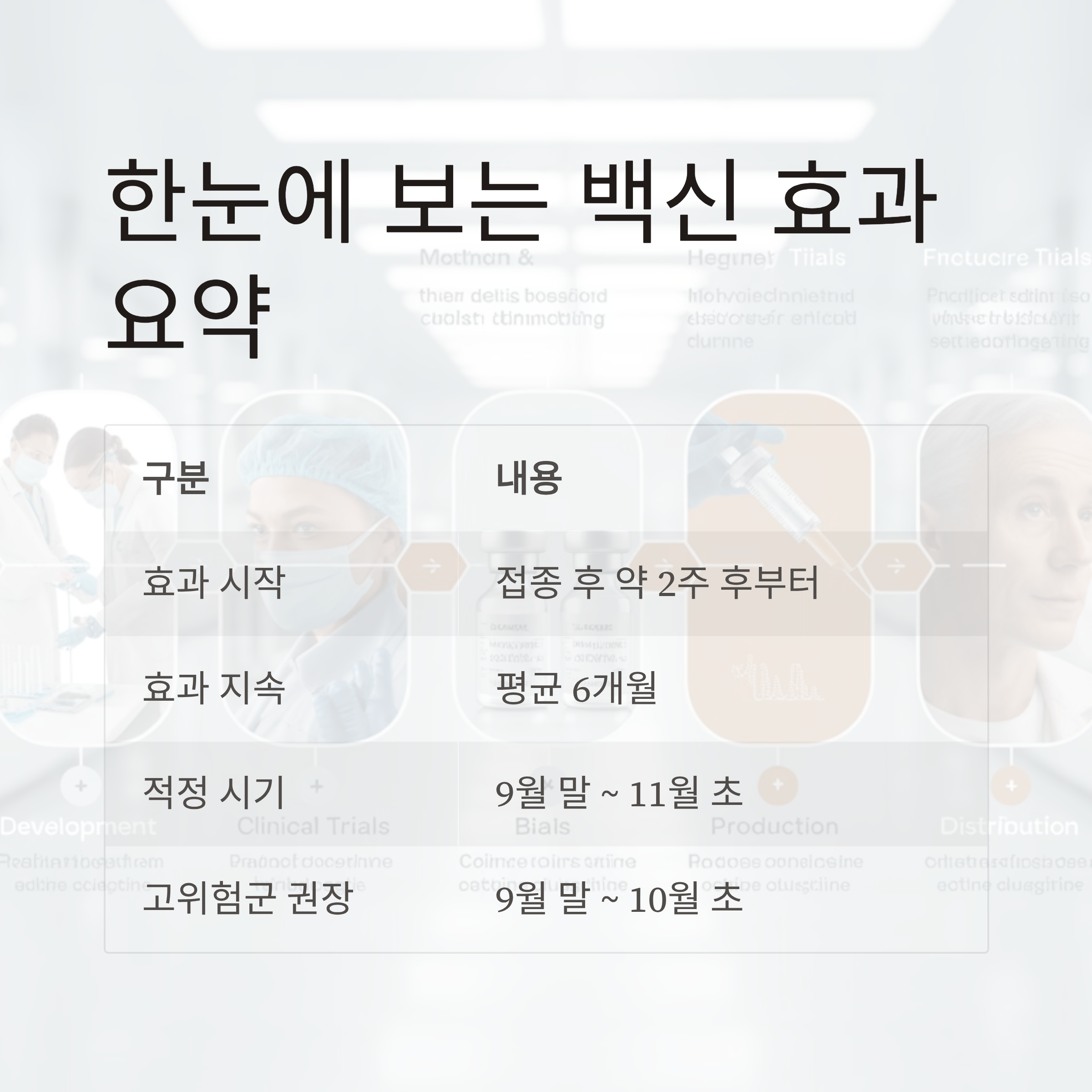 다음 표는 독감백신의 효과 시점과 지속기간, 적정 접종 시기를 정리한 것입니다.