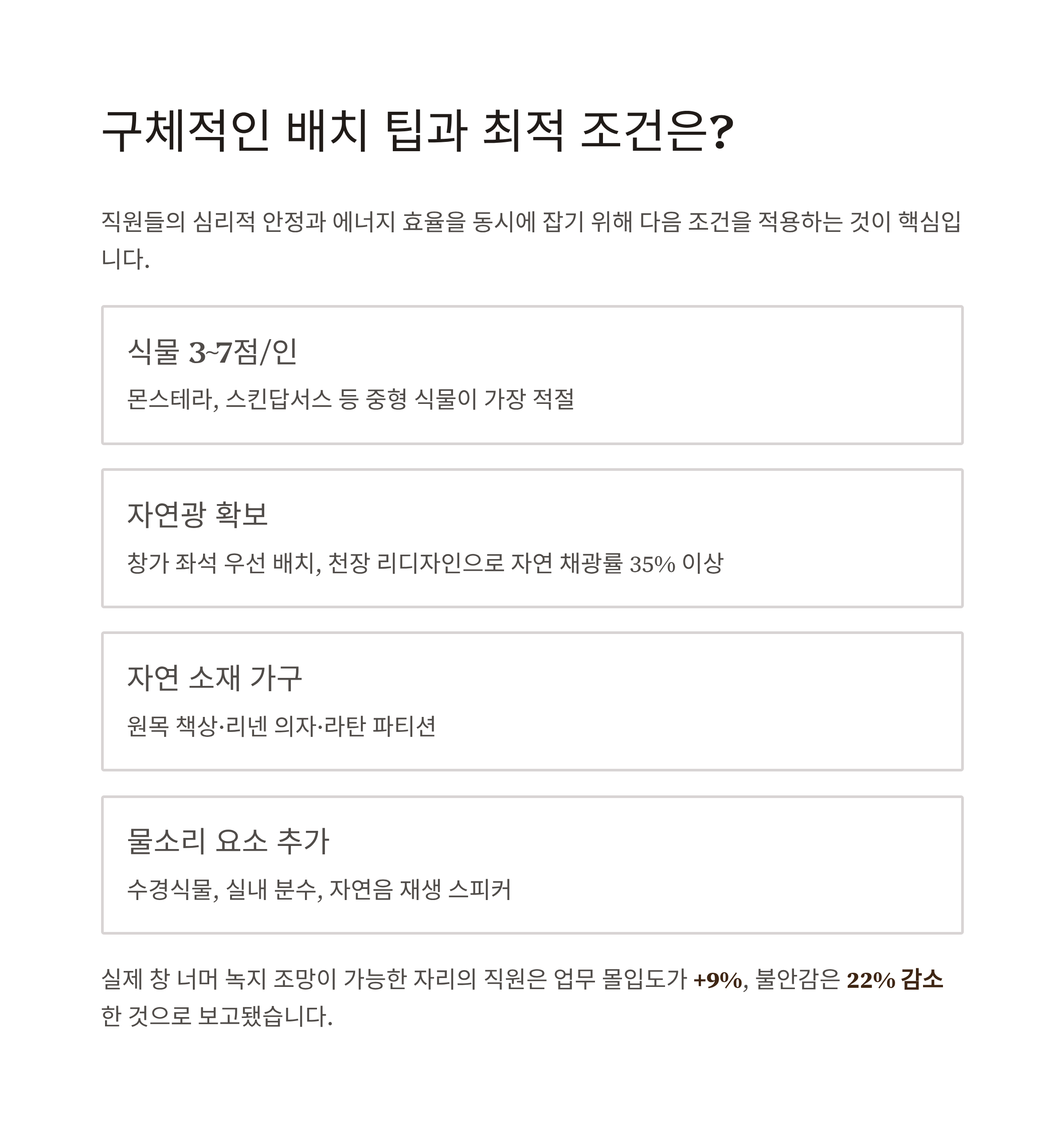 다음은 바이오필릭 디자인 도입 후 관찰된 주요 효과입니다.