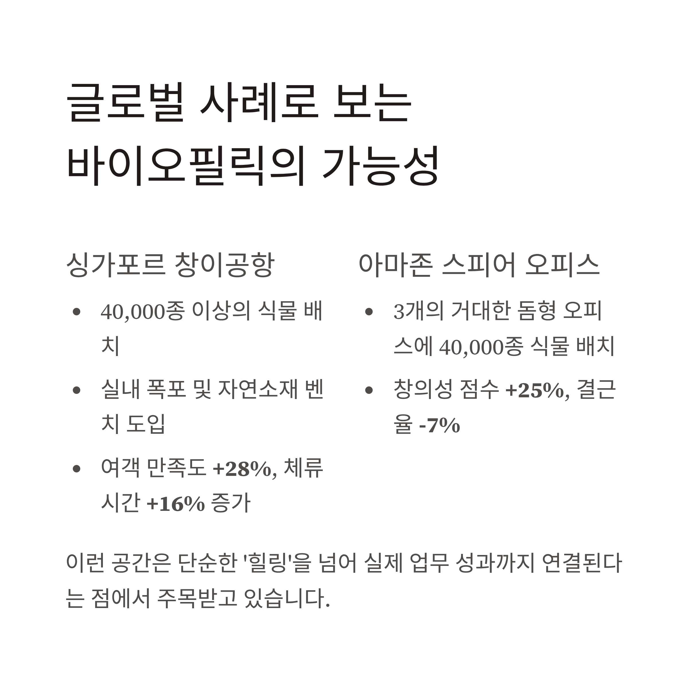 바이오필릭 디자인은 단순한 유행이 아니라 생산성, 창의성, 직원 만족도 모두를 끌어올리는 실질적인 솔루션입니다.
