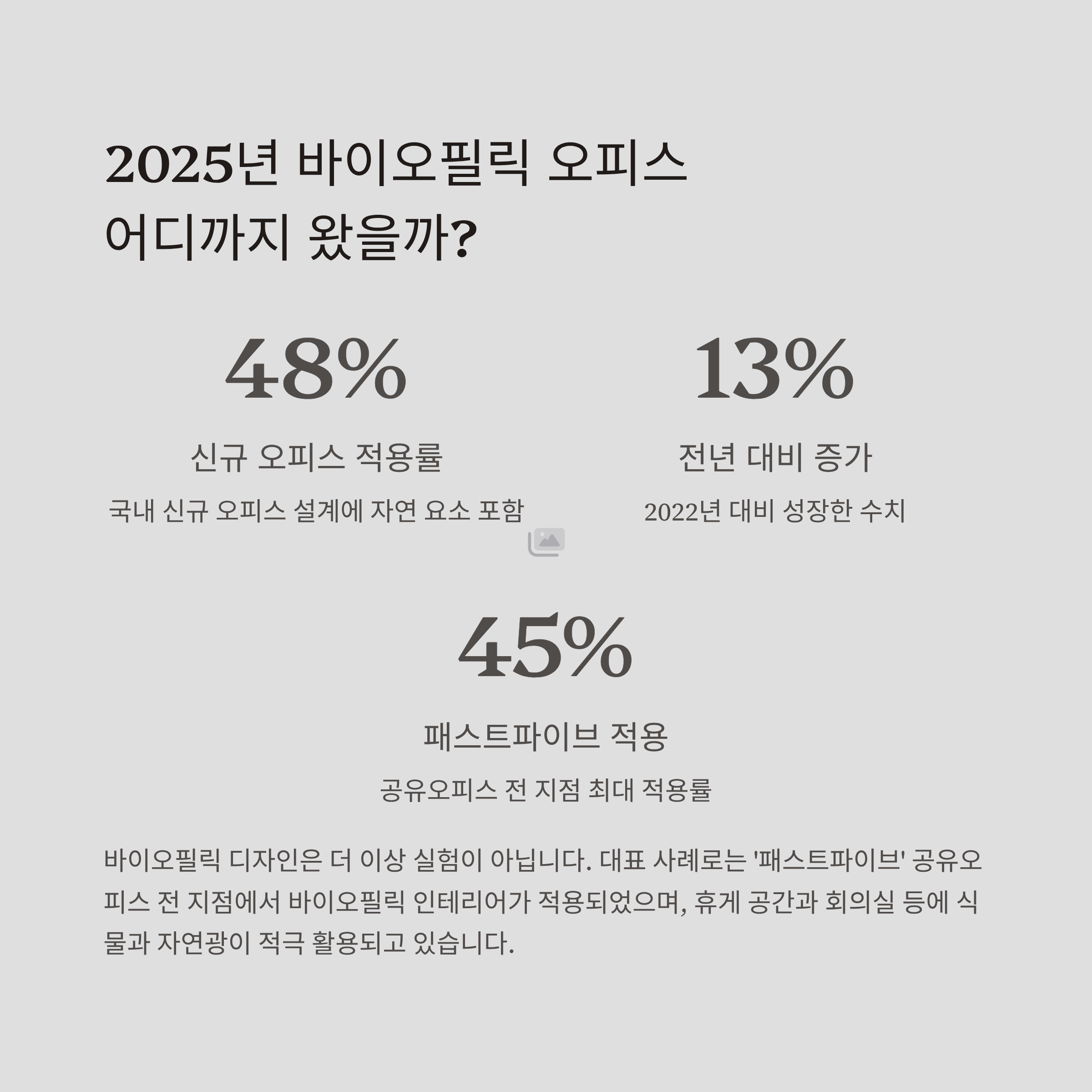 2025년 기준, 국내 신규 오피스 설계의 48%가 자연 요소를 포함하고 있으며, 이는 2022년 대비 13% 증가한 수치입니다.