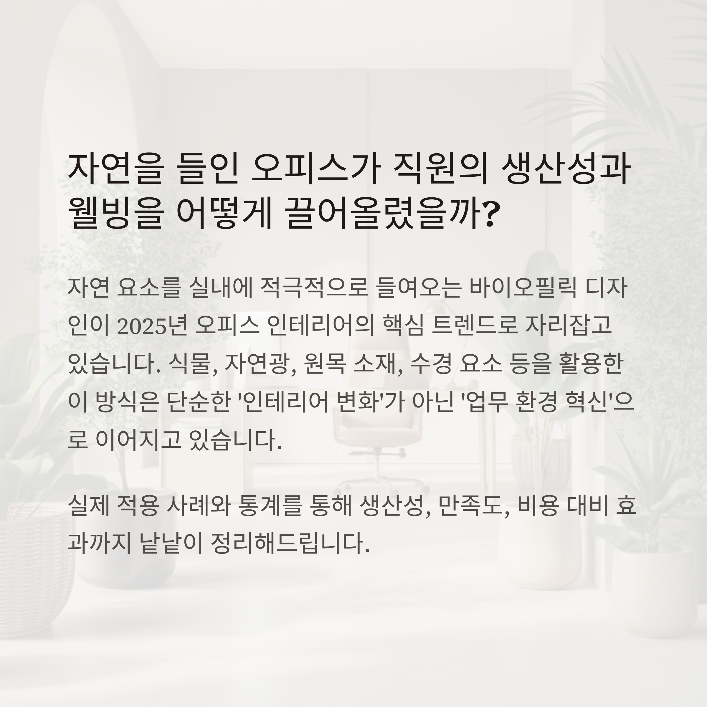 자연 요소를 실내에 적극적으로 들여오는 바이오필릭 디자인이 2025년 오피스 인테리어의 핵심 트렌드로 자리 잡고 있습니다. 식물, 자연광, 원목 소재, 수경 요소 등을 활용한 이 방식은 단순한 ‘인테리어 변화’가 아닌 ‘업무 환경 혁신’으로 이어지고 있습니다. 실제 적용 사례와 통계를 통해 생산성, 만족도, 비용 대비 효과까지 낱낱이 정리해 드립니다.