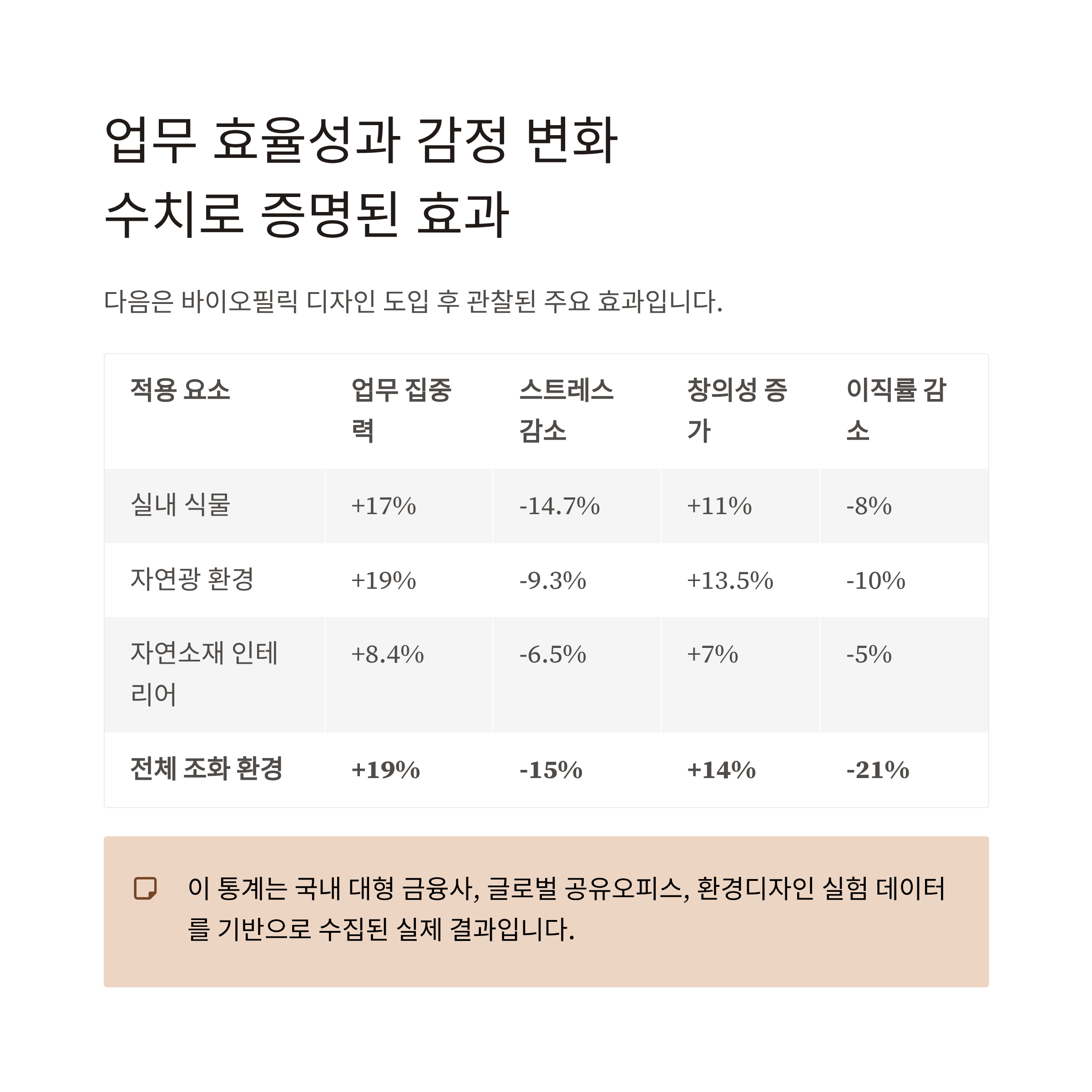 이 통계는 국내 대형 금융사, 글로벌 공유오피스, 환경디자인 실험 데이터를 기반으로 수집된 실제 결과입니다.