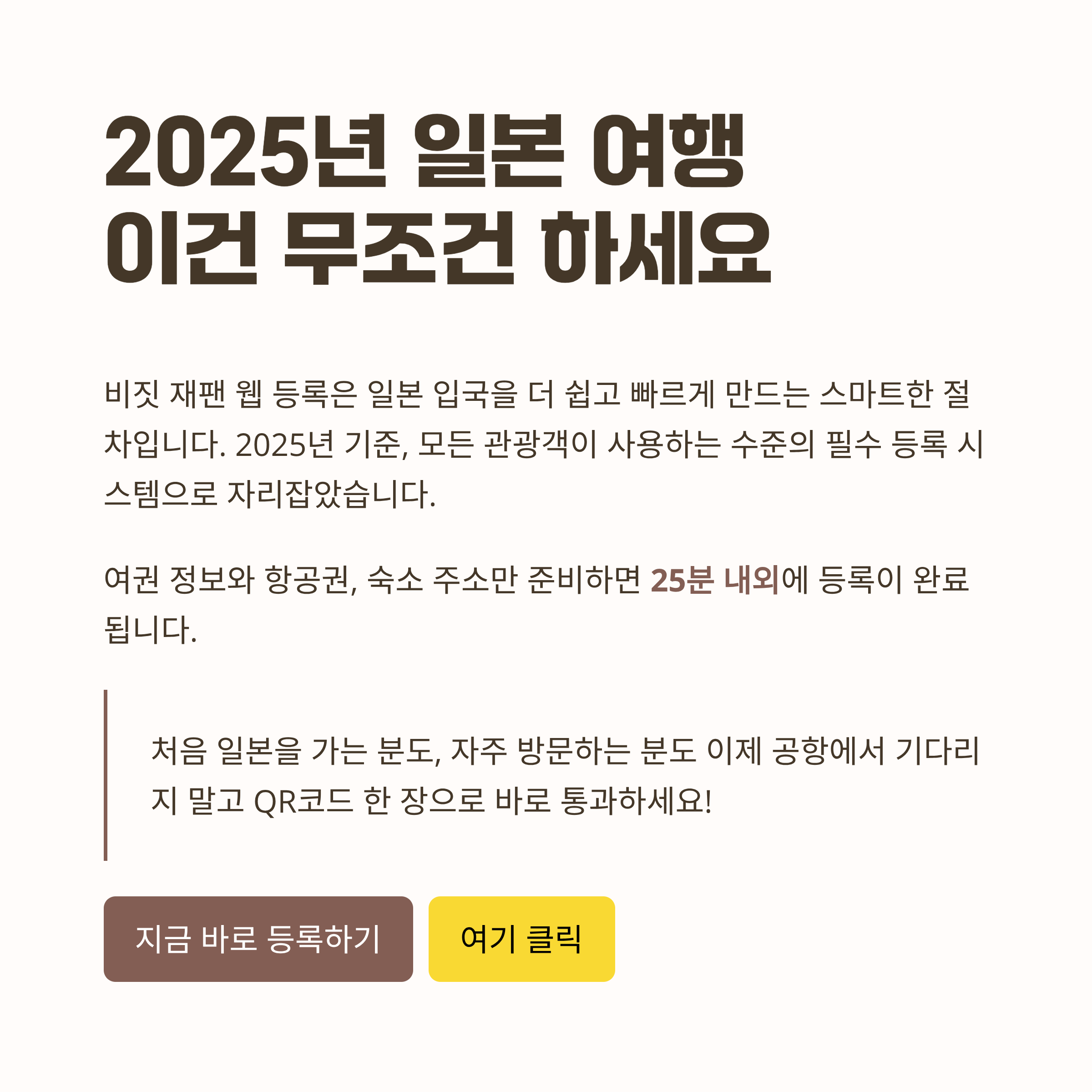 일본 여행을 준비 중이라면 ‘비짓 재팬 웹(Visit Japan Web)’ 등록은 더 이상 선택이 아닌 필수입니다. 2025년 기준, 입국·세관·검역 절차를 미리 온라인으로 처리할 수 있어 실제 공항 대기 시간을 20분 이상 줄일 수 있고, 종이 서류도 따로 작성할 필요가 없습니다. 이번 글에서는 사전 준비물부터 단계별 등록법, 실전 팁까지 전부 정리해 드릴게요.