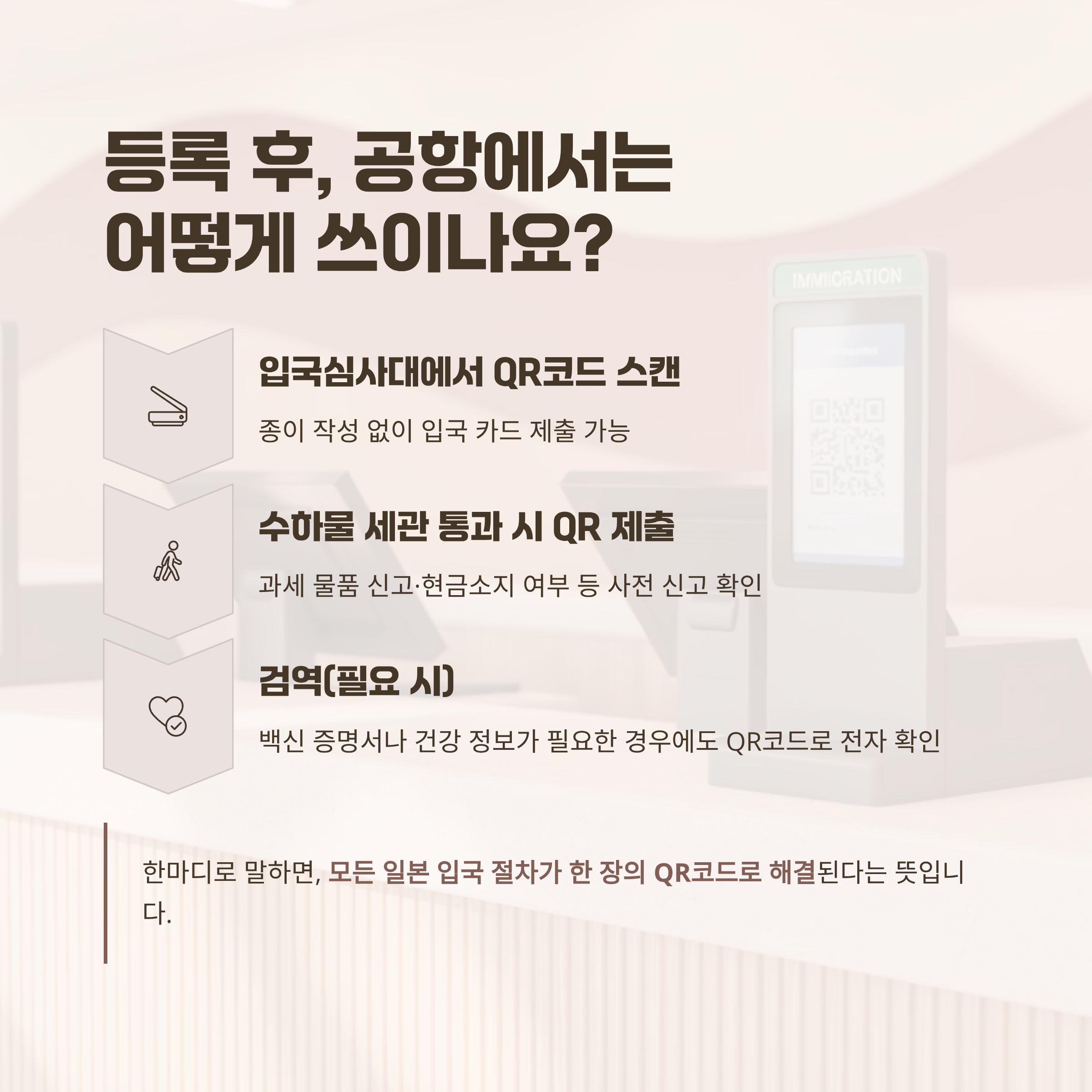한마디로 말하면, 모든 일본 입국 절차가 한 장의 QR코드로 해결된다는 뜻입니다.