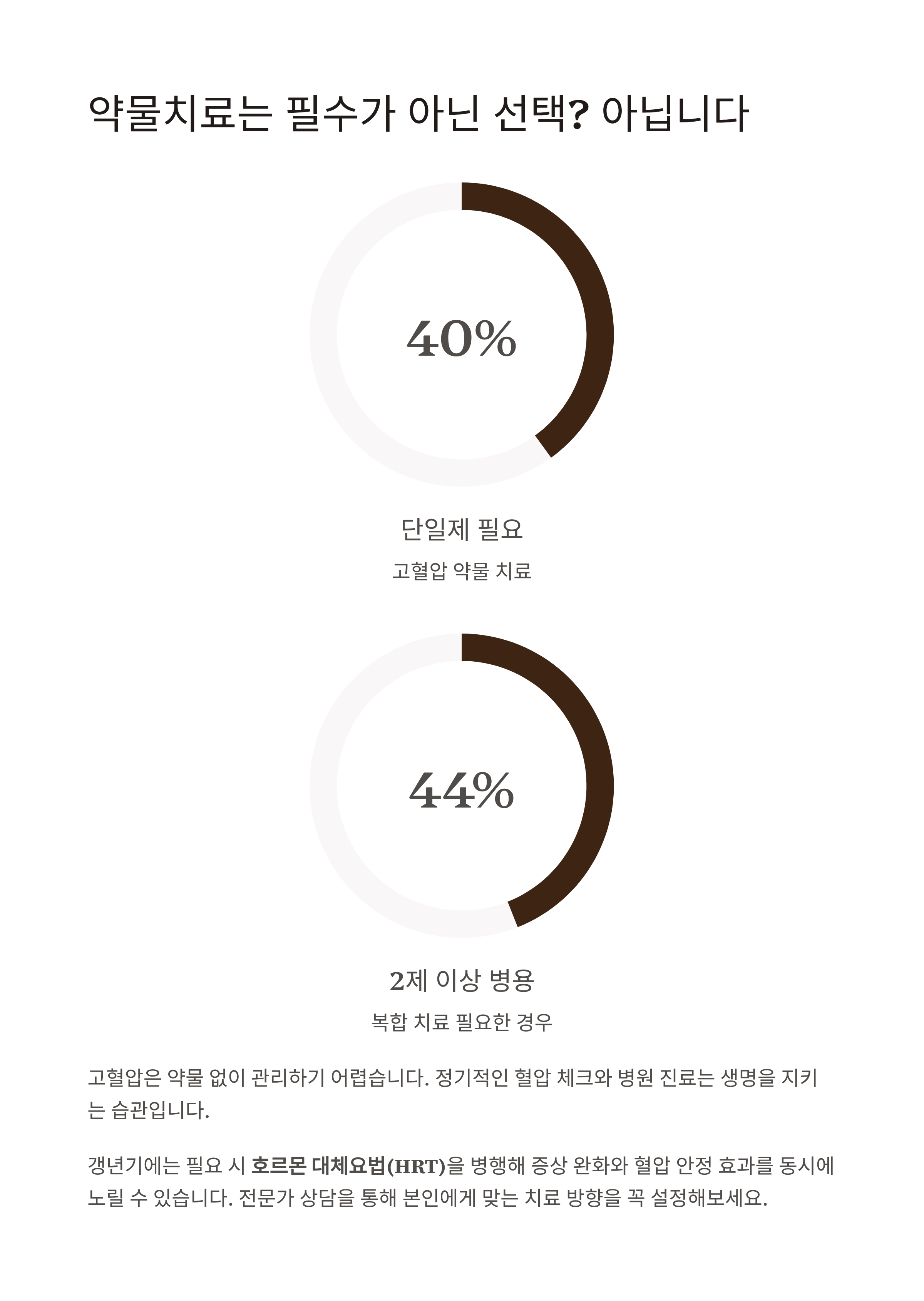 40%는 단일제, 44%는 2제 이상 병용 치료가 필요하며, 정기적인 혈압 체크와 병원 진료는 생명을 지키는 습관입니다.