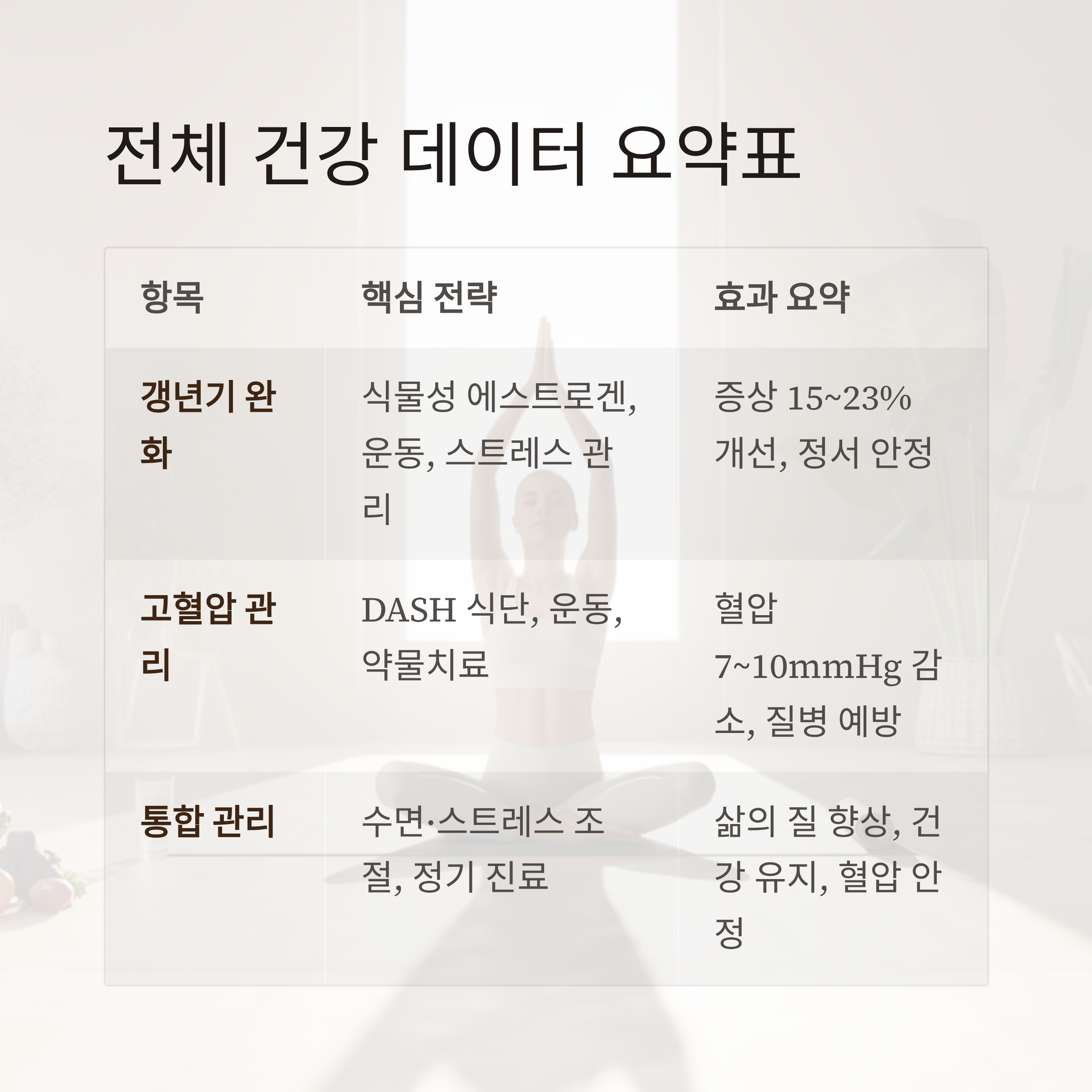| 갱년기 완화 | 식물성 에스트로겐, 운동, 스트레스 관리 | 증상 15~23% 개선, 정서 안정 |