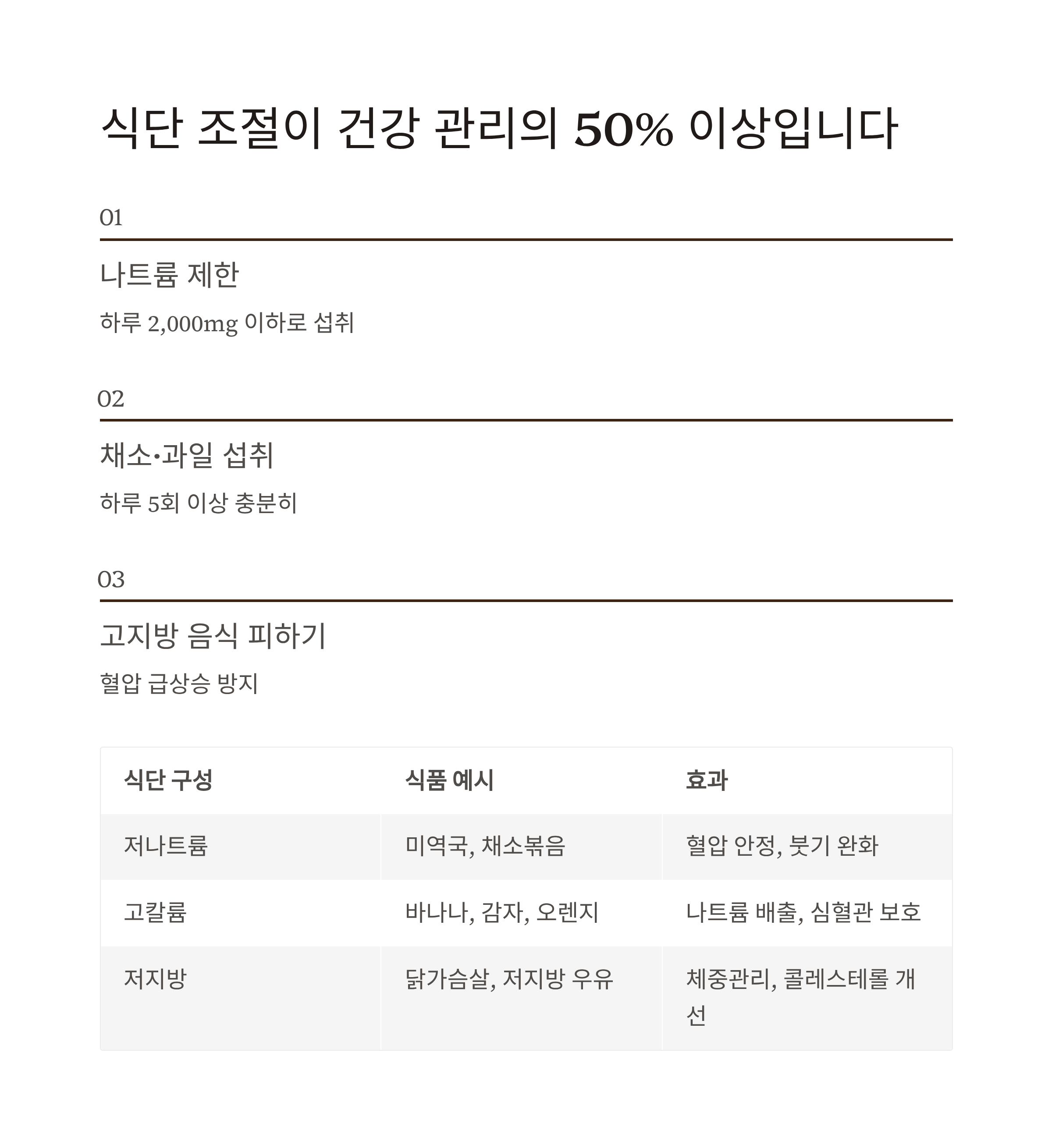 나트륨 섭취는 하루 2,000mg 이하로 제한하고, 채소·과일은 하루 5회 이상 섭취해야 합니다.