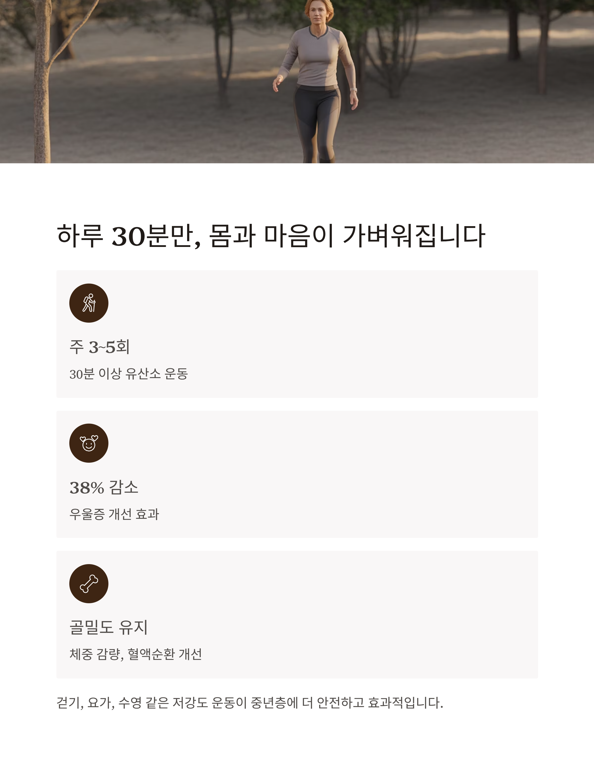 주 3~5회, 30분 이상 운동하면 골밀도 유지, 체중 감량, 혈액순환 개선은 물론, 우울증 감소 효과도 38%에 달합니다.