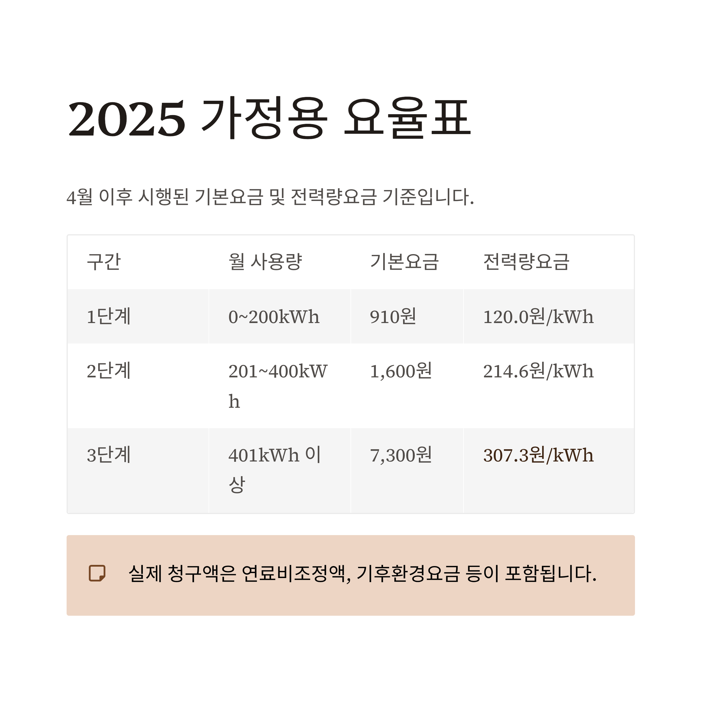 아래는 2025년 4월 이후 시행된 기본요금 및 전력량요금 기준입니다.