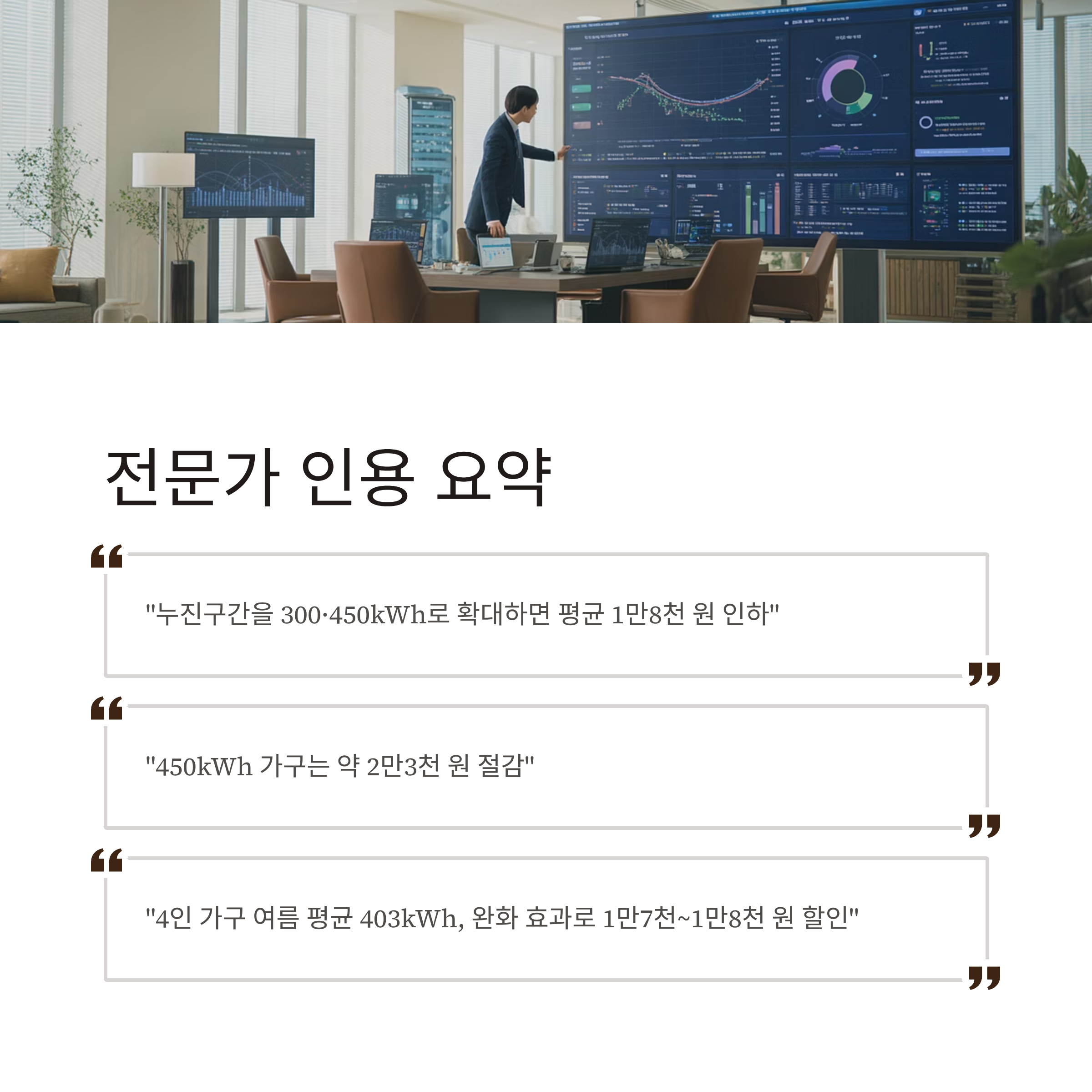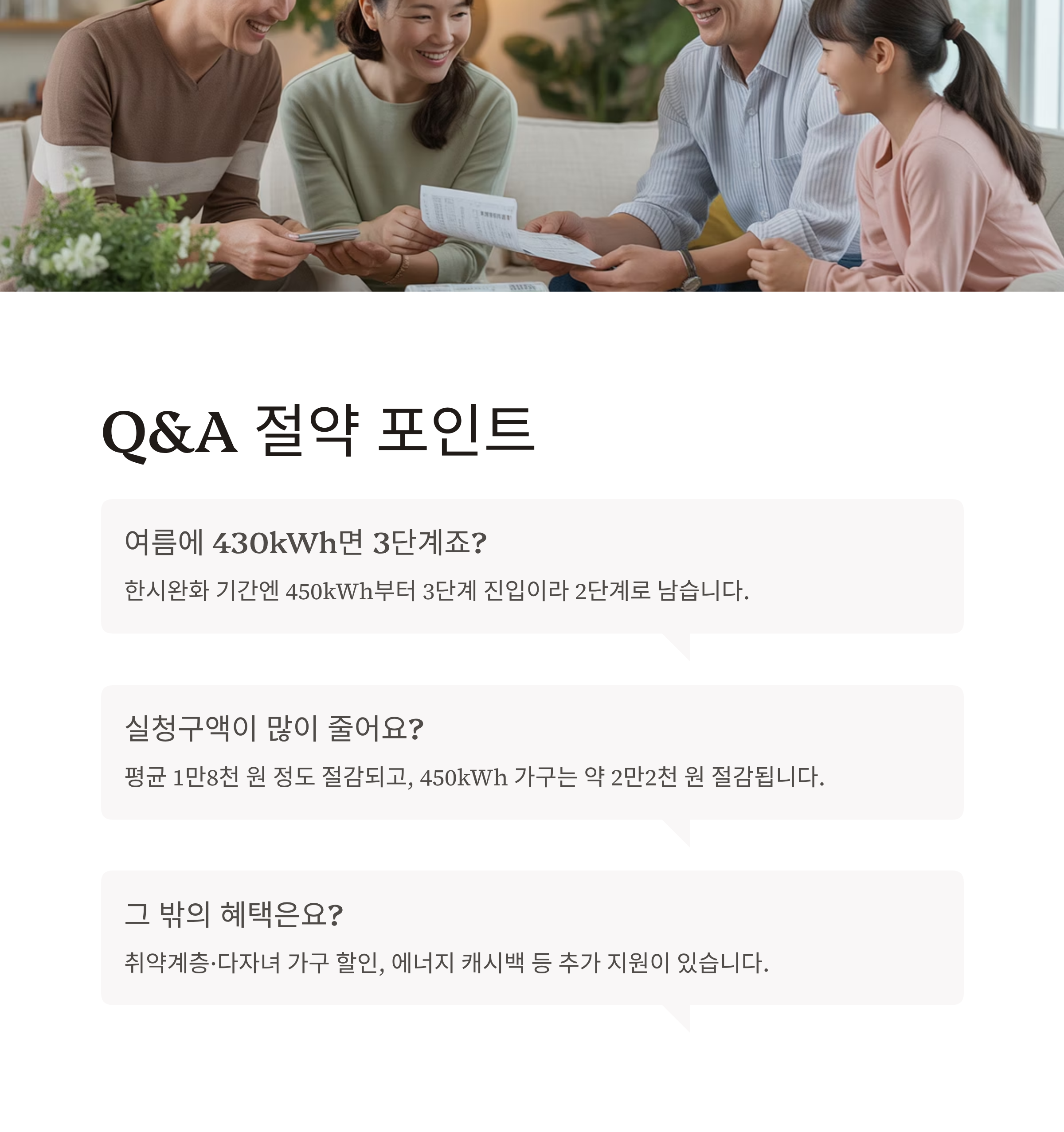 “4인 가구 여름 평균 403 kWh, 완화 효과로 1만 7천~1만 8천 원 할인.”