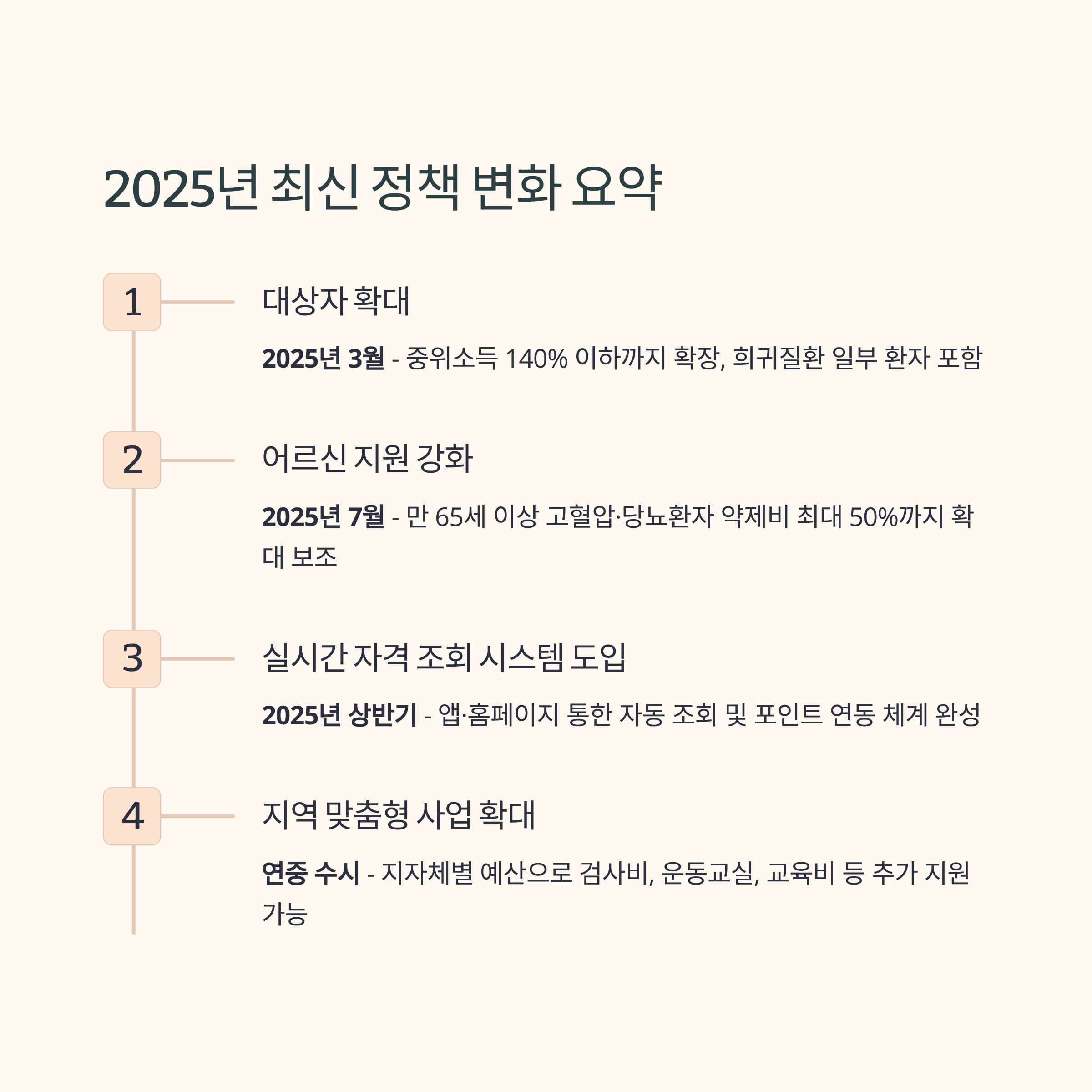 | 대상자 확대 | 2025년 3월 | 중위소득 140% 이하까지 확장, 희귀질환 일부 환자 포함 |