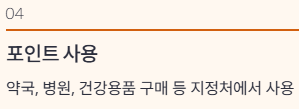 - 포인트는 약국, 병원, 건강용품 구매 등 지정처에서 사용 가능