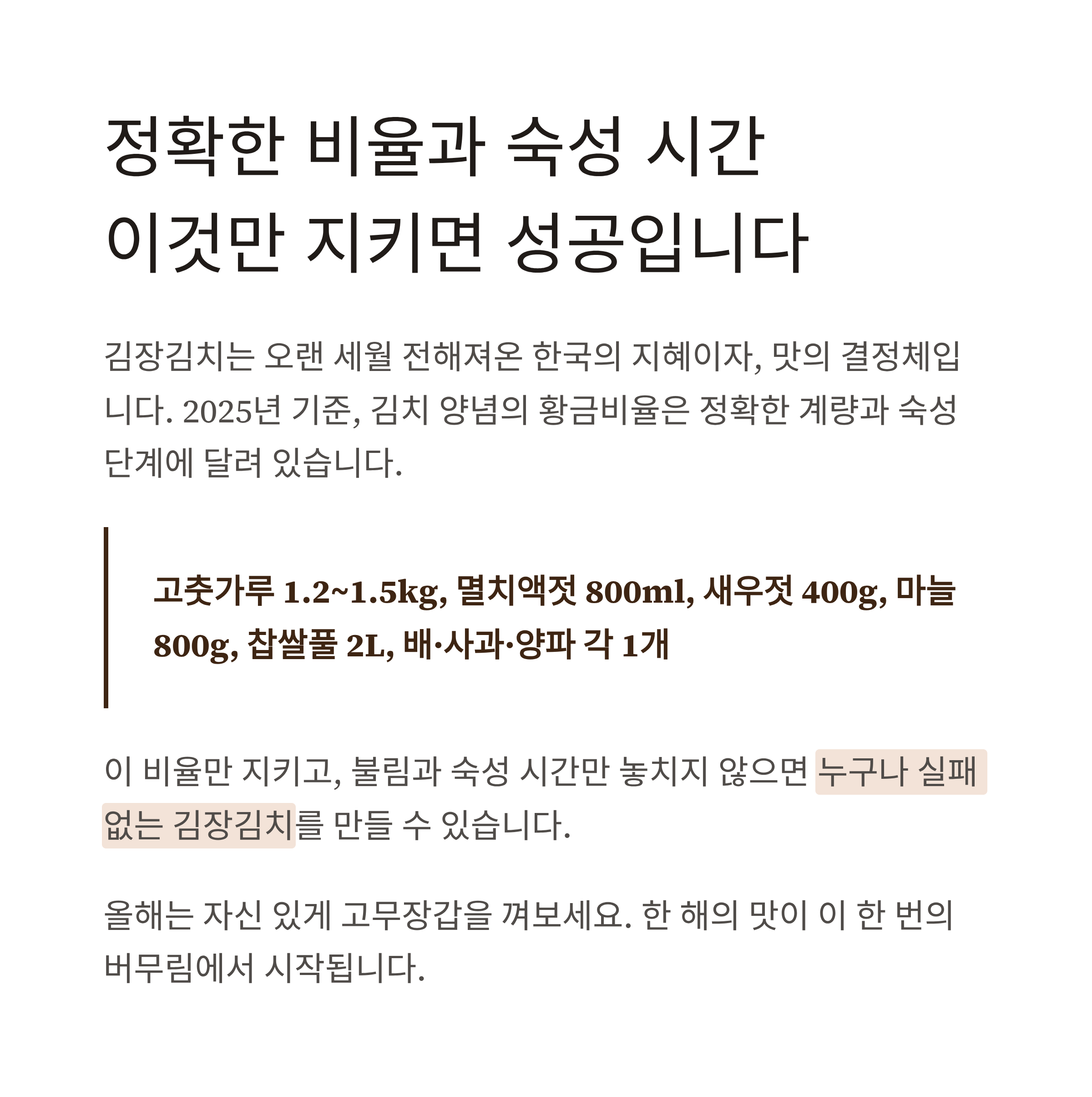 이 비율만 지키고, 불림과 숙성 시간만 놓치지 않으면 누구나 실패 없는 김장김치를 만들 수 있습니다.