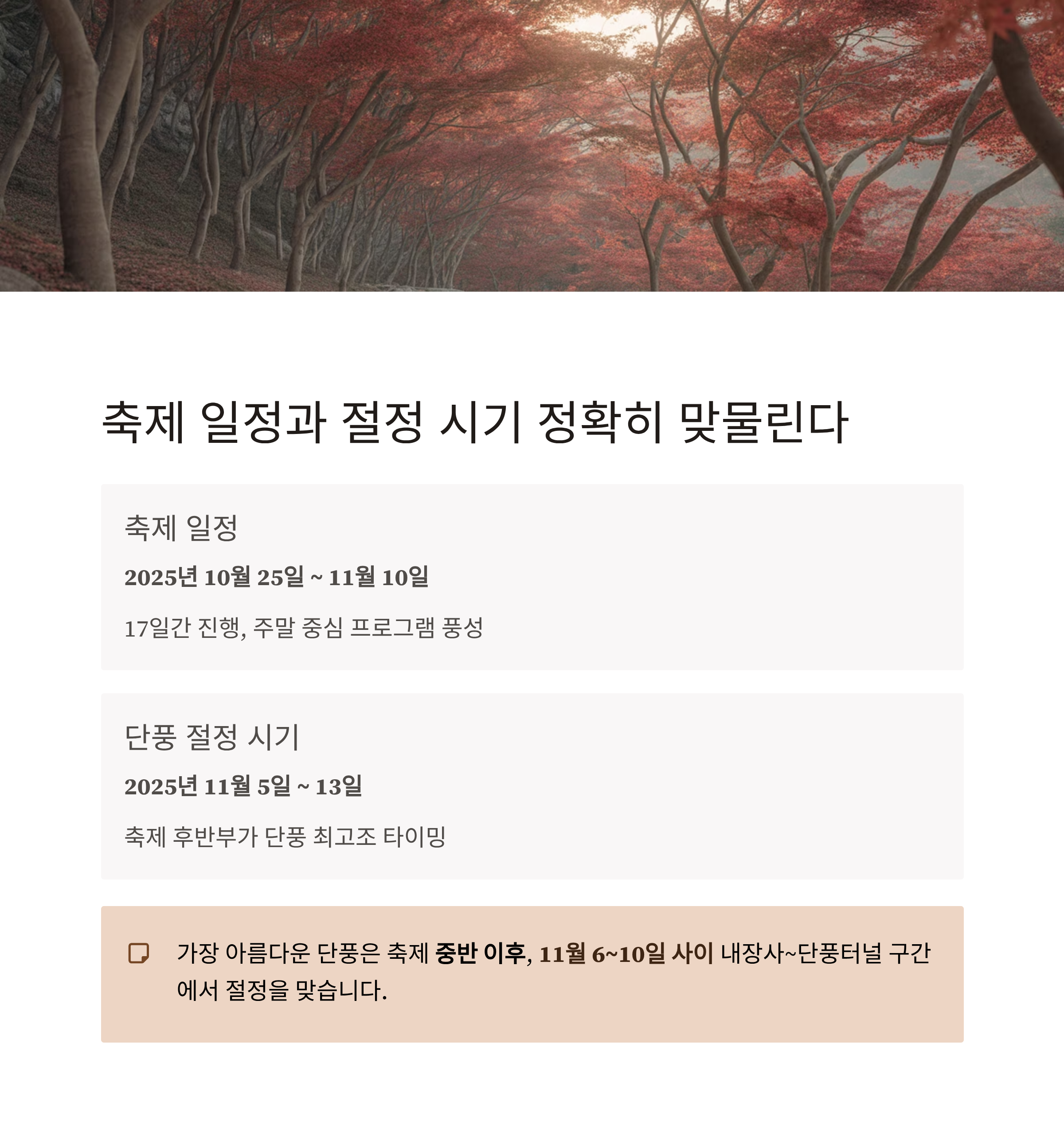 | 단풍 절정 시기 | 2025년 11월 5일 ~ 13일 | 축제 후반부가 단풍 최고조 타이밍 |