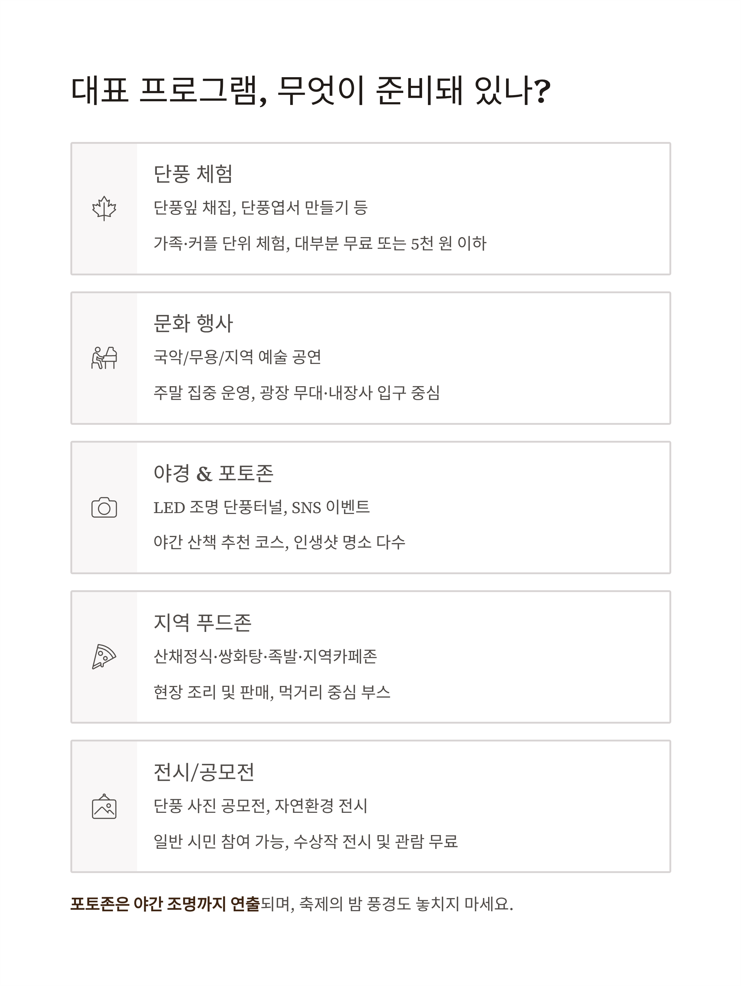 | 야경 & 포토존 | LED 조명 단풍터널, SNS 이벤트 | 야간 산책 추천 코스, 인생샷 명소 다수 존재 |