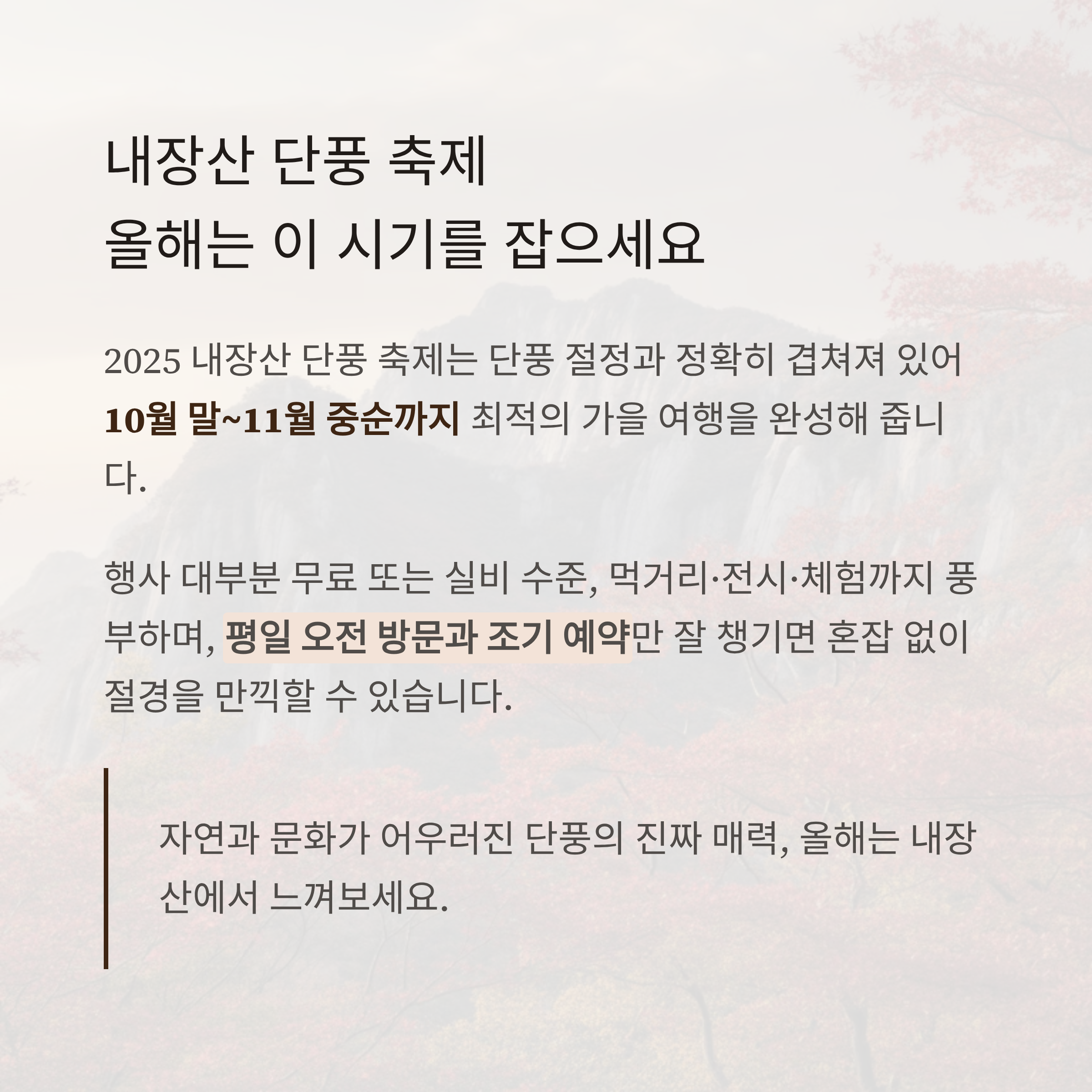 정읍시 전역이 붉게 물드는 이 시기, 알차게 즐길 수 있도록 최신 일정과 꿀팁을 정리했습니다.