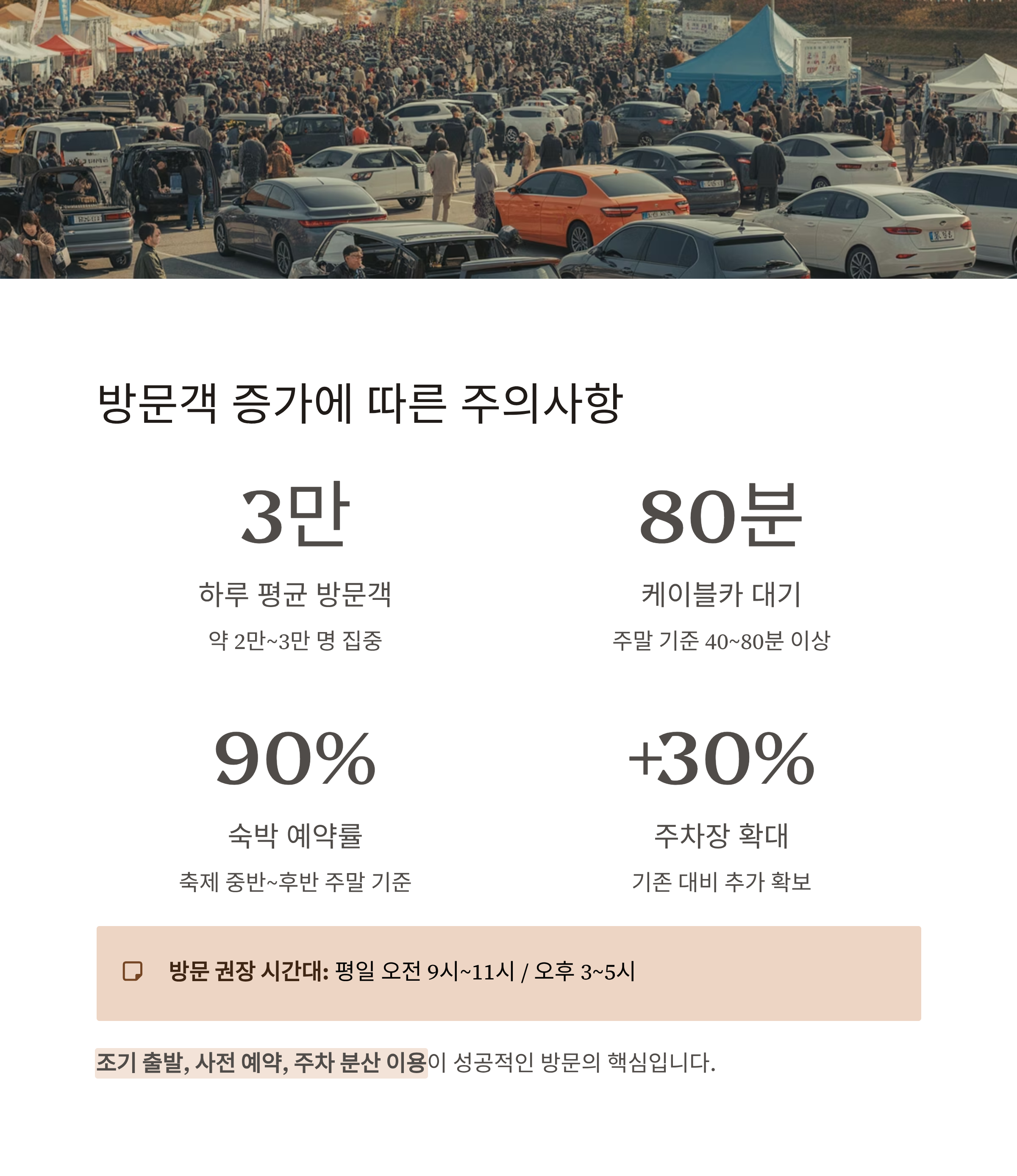 조기 출발, 사전 예약, 주차 분산 이용이 성공적인 방문의 핵심입니다.
