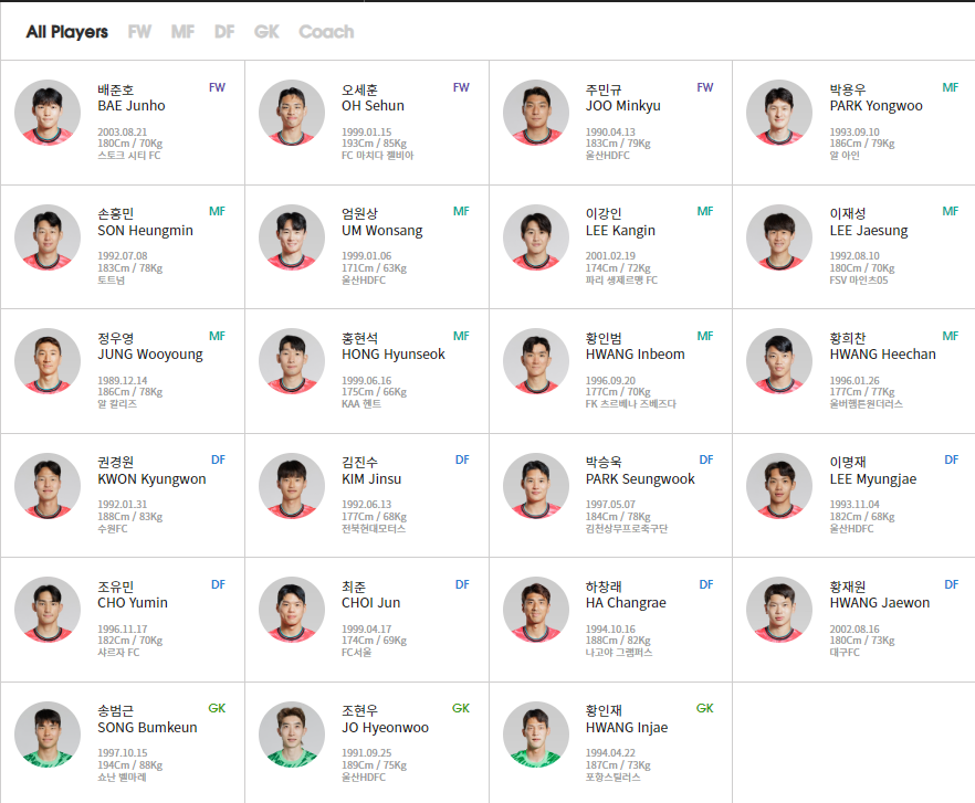 - DF: 권경원(수원 FC), 박승욱(김천상무), 조유민(샤르자), 하창래(나고야), 김진수(전북 현대), 이명재(울산 HD), 황재원(대구 FC), 최준(FC 서울)