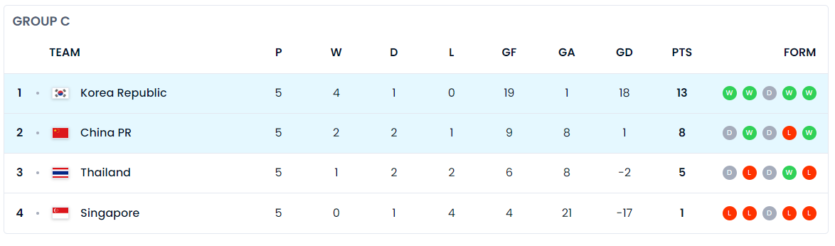 현재 우리나라 축구대표팀 순위입니다. 현재 대한민국은 C조에서 4승1무로 1위를 차지하고 있으며, 중국, 태국, 싱가포르와 경쟁하고 있습니다. 승점 상황은 다음과 같습니다. 골득실차도 18골로 많은 차이가 납니다.