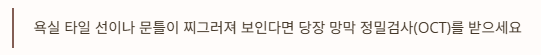 만약 한쪽 눈을 가리고 봤을 때 욕실 타일 선이나 문틀이 찌그러져 보인다면 당장 망막 정밀검사(OCT)를 받아야 합니다.