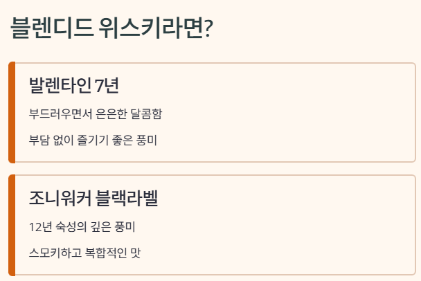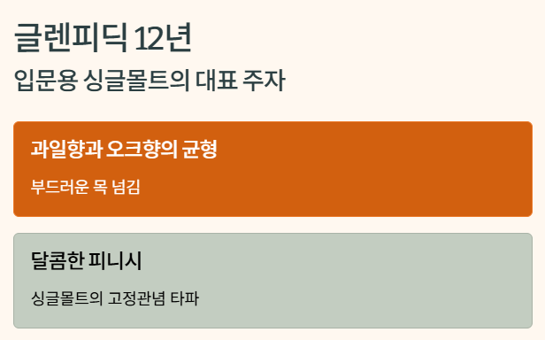| 위스키 처음 마신다면 | 글렌피딕 12, 탐나불린 셰리 | 부드럽고 접근성 좋은 맛 |