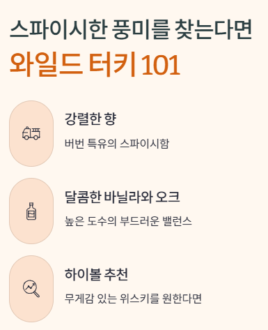 | 강한 위스키 좋아할 때 | 와일드 터키 101 | 높은 도수와 진한 향, 스파이시한 매력 |