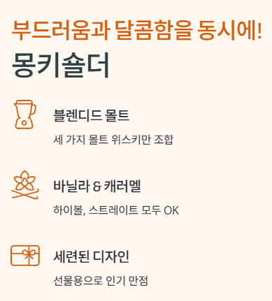 | 몽키숄더 | 블렌디드 몰트 | 바닐라향, 캐주얼한 맛, 선물용 인기 |