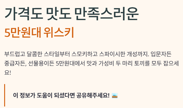 5만 원대 위스키는 입문자부터 위스키를 어느 정도 즐겨본 분들까지 모두 만족시킬 수 있는 가격대입니다. 싱글 몰트, 블렌디드, 버번 등 다양한 스타일이 이 가격대에 포진해 있어 선택의 폭도 넓습니다. 이번 글에서는 2025년 최신 추천 리스트를 바탕으로 가성비, 풍미, 스타일별 특징을 정리해 드릴게요.