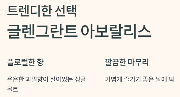 | 글렌그란트 아보랄리스 | 싱글몰트 | 플로럴, 깔끔한 마무리, 트렌디한 스타일 |
