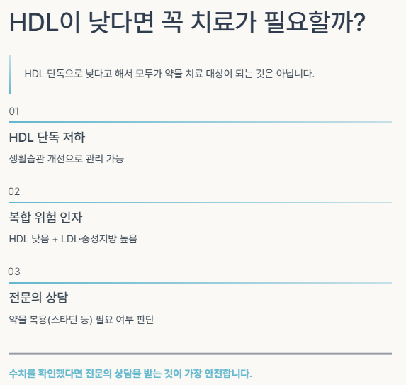 HDL 단독으로 낮다고 해서 모두가 약물 치료 대상이 되는 것은 아닙니다.