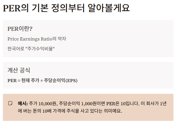 예를 들어 볼게요. 주가가 10,000원이고, 1주당 순이익이 1,000원이라면 PER은 10입니다. 이건 “이 회사가 1년에 버는 돈의 10배 가격에 주식을 사고 있다”는 의미예요.