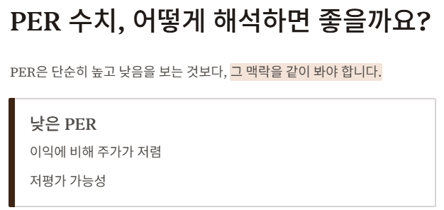 | 낮을수록 | 이익에 비해 주가가 저렴 (저평가 가능성) |