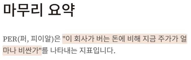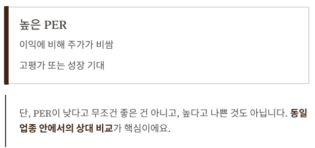 | 높을수록 | 이익에 비해 주가가 비쌈 (고평가 또는 성장 기대) |