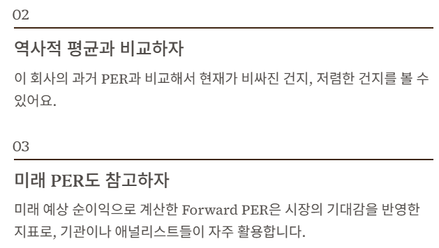 이 회사의 과거 PER과 비교해서 현재가 비싸진 건지, 저렴한 건지를 볼 수 있어요. - 미래 PER(Forward PER)도 참고하자
