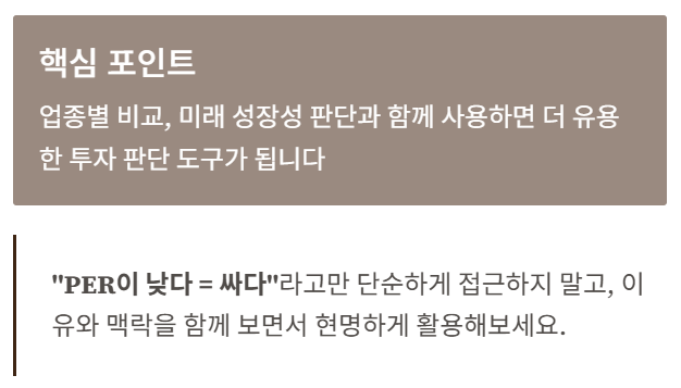 단점도 있어요. PER은 기본적으로 과거 실적 기반이라, 미래에 이익이 얼마나 증가할지까지는 반영하지 못합니다. 그래서 PER만 보지 말고, 성장성, 업황, 미래 전망도 같이 봐야 정확한 판단이 가능합니다.