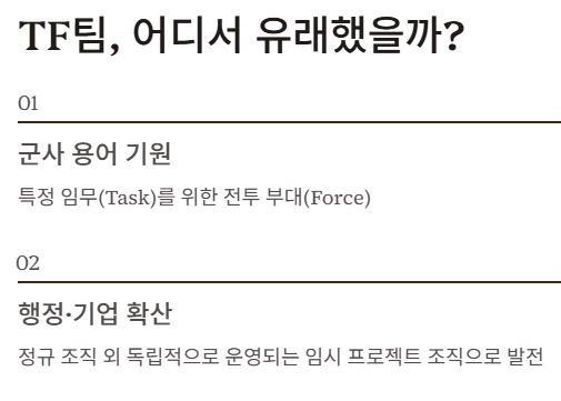 정규 조직 외 독립적으로 운영되는 임시 프로젝트 조직이라는 의미로 자리 잡았습니다.