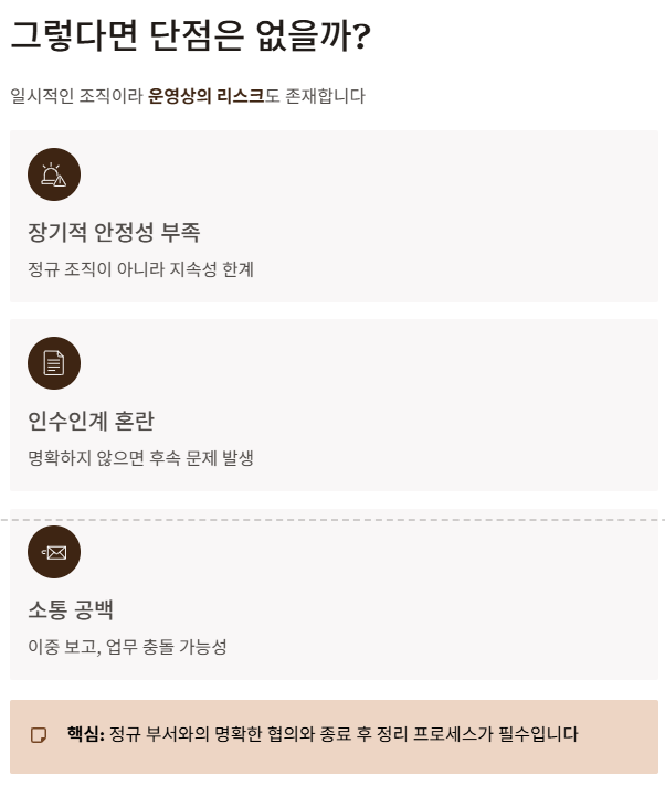 TF팀은 일시적인 조직이라 다음과 같은 운영상의 리스크도 존재합니다.