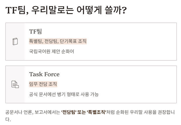 | TF팀 | 특별팀, 전담팀, 단기목표 조직 | 국립국어원에서 제안된 순화어 사용 권장 |