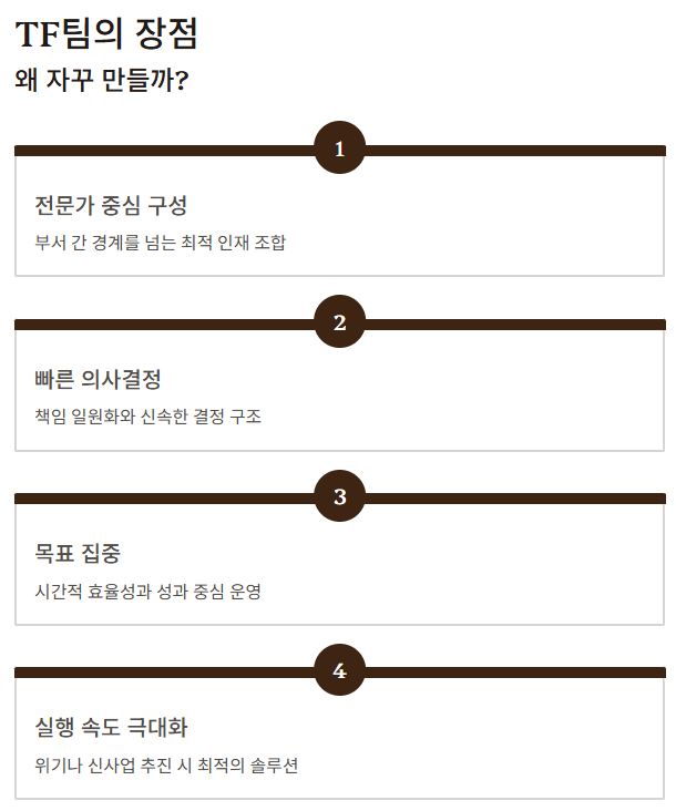 2025년 기준, 정부·기업·비상대책본부까지 TF팀 활용은 꾸준히 증가하고 있습니다.